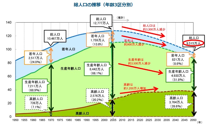 その頃になると、65歳の高齢者の割合は39%、若年層(15歳未満)と合せた割合は、総人口の約半分になります。これは、1人の就労者が1人の非就労者を社会的に支援する世の中が来ることを意味しています。