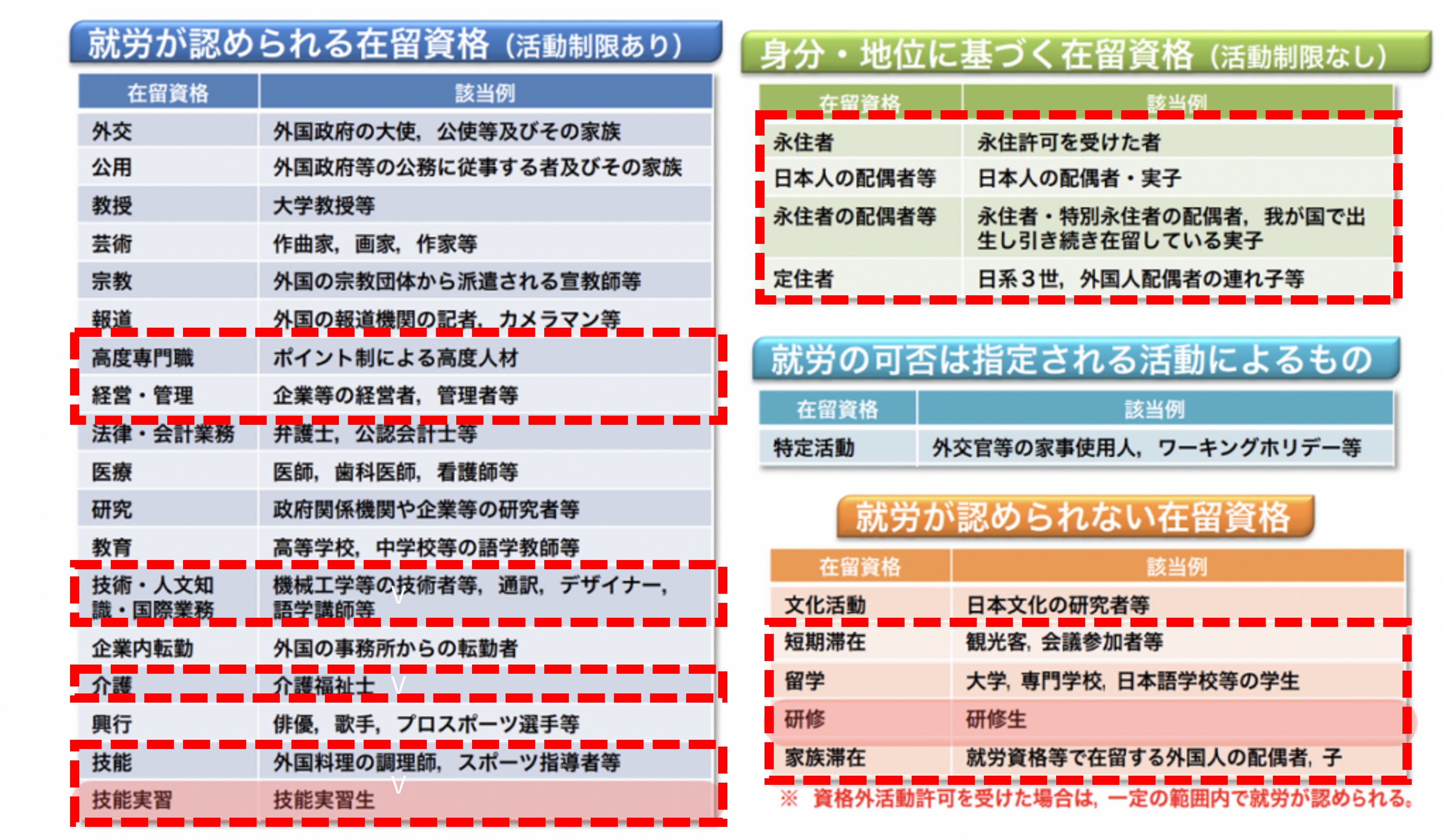 このうち、当事務所で取扱いが可能なものは、次の図の赤点線で示している在留資格となります。